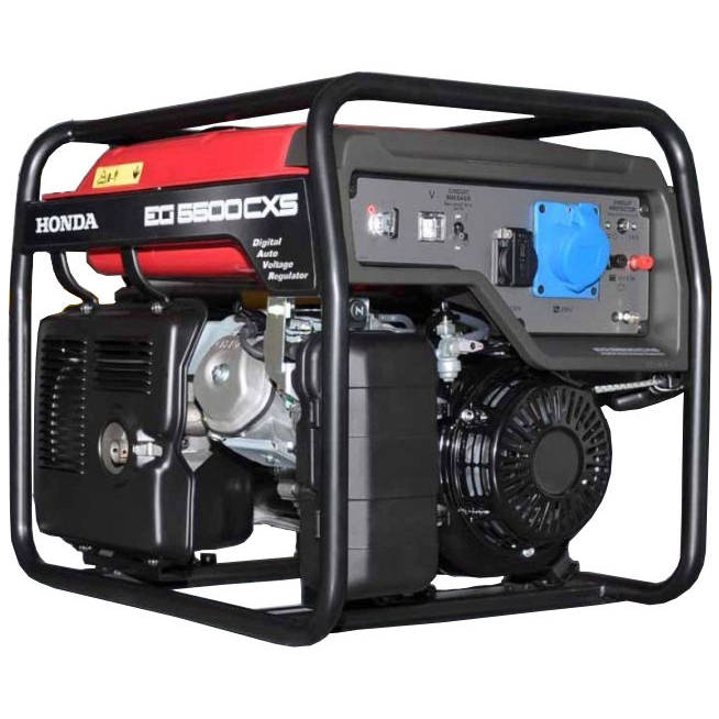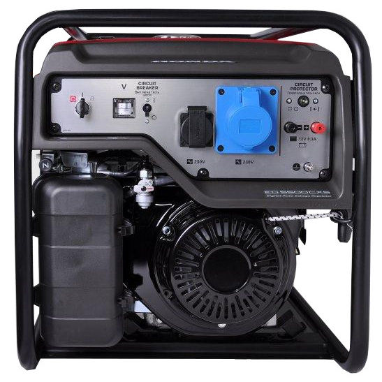 Для регулировки напряжения бензоэлектрогенератор Honda EG 5500CXS оснащен блоком AVR, что позволяет устройству стабильно работать даже при резком изменении нагрузки. Обмотки альтернатора изготовлены из чистой меди, поэтому устройство имеет высокий КПД и хорошую теплоотдачу. Максимальная мощность генератора составляет 5,5 кВт. Для подключения электроприборов имеются две розетки с напряжением 220 В и выход для зарядки аккумулятора 12 В.