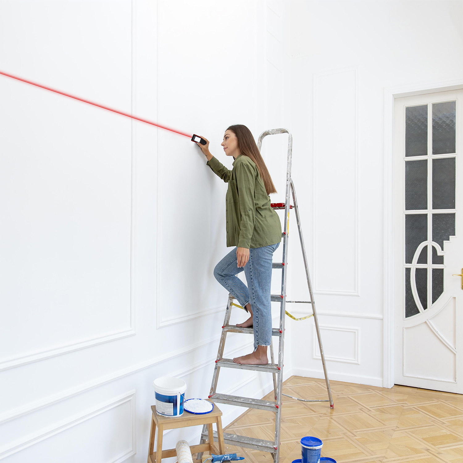 Сделав всего два замера, пользователь может определить длину отрезка, даже если этот отрезок проходит сквозь здания или препятствия (стена, деревья, забор и т. д.).
