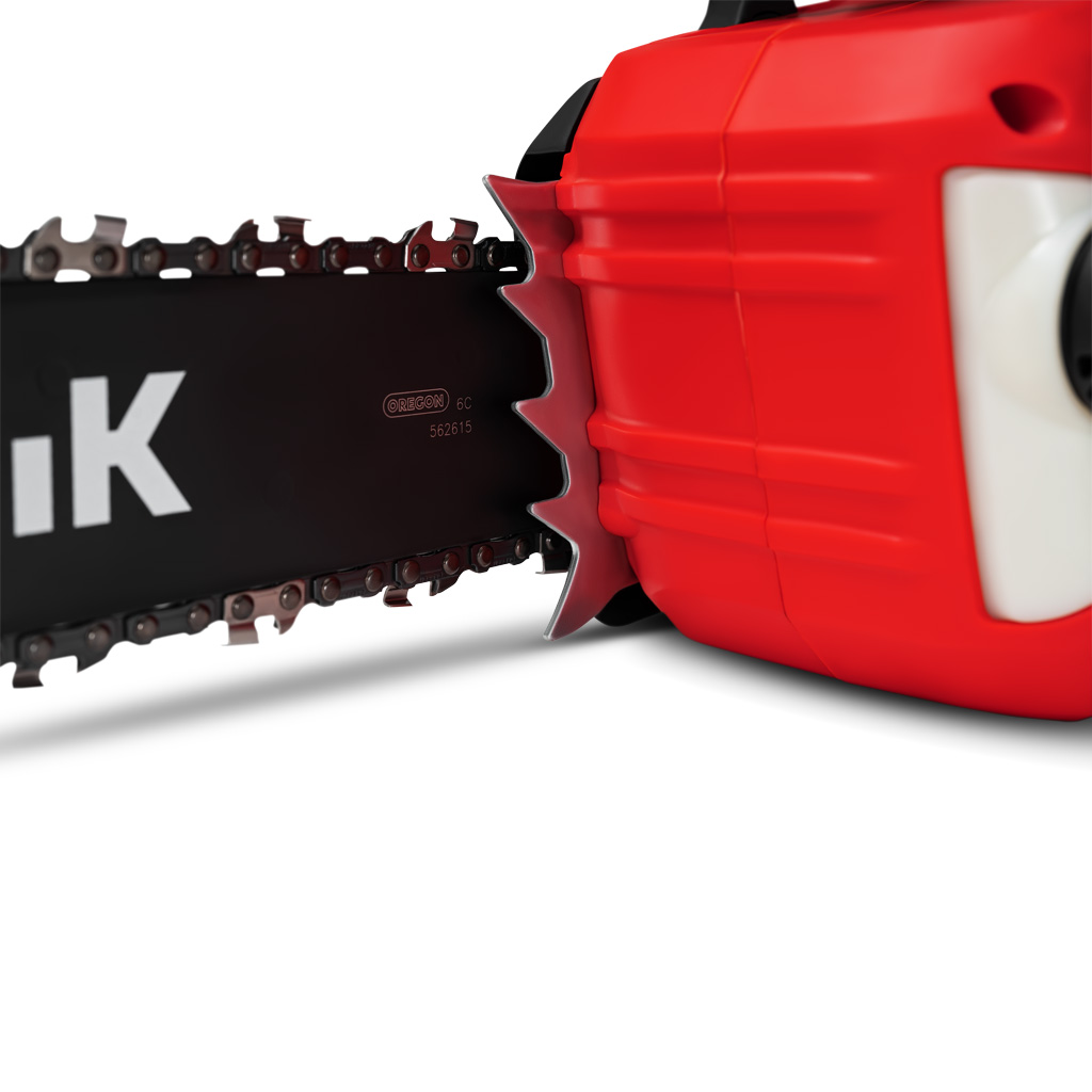 Надежный стальной цепеуловитель, в отличие от пластикового, обеспечит безопасность в ситуации обрыва цепи. Инерционный тормоз цепи срабатывает автоматически при нештатных ситуациях, предотвращая отброс бензопилы с вращающейся цепью. Надежная фиксация упора бензопилы в древесине перед распилом исключает работу на весу.